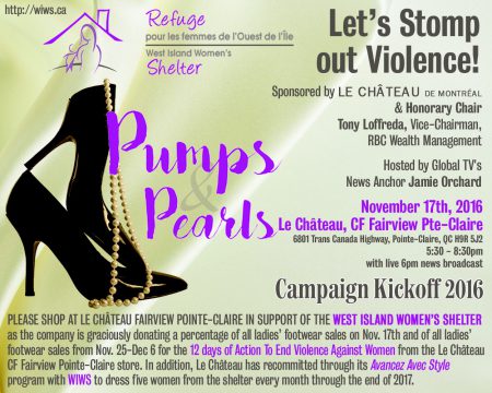 DetailsPlease shop at Le Château Fairview Pointe Claire in support of the West Island Women’s Shelter as the company is graciously donating a percentage of all ladies footwear sales on November 17 and all of the ladies footwear sales from November 25 to December 6 for the “12 days of action to end violence against…